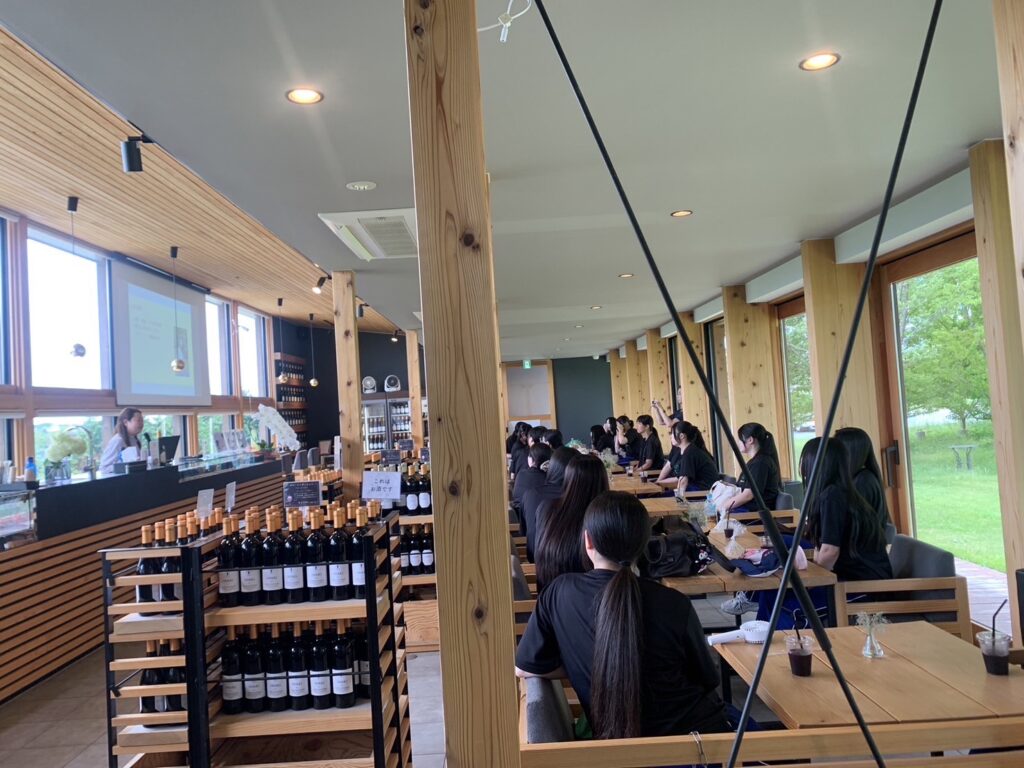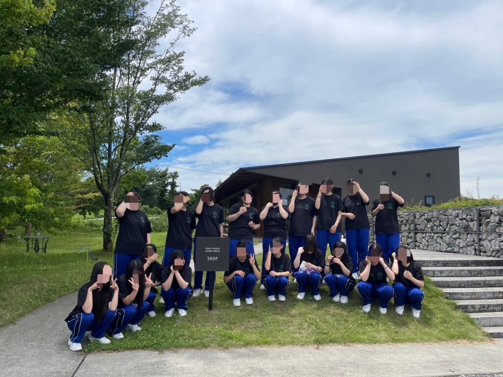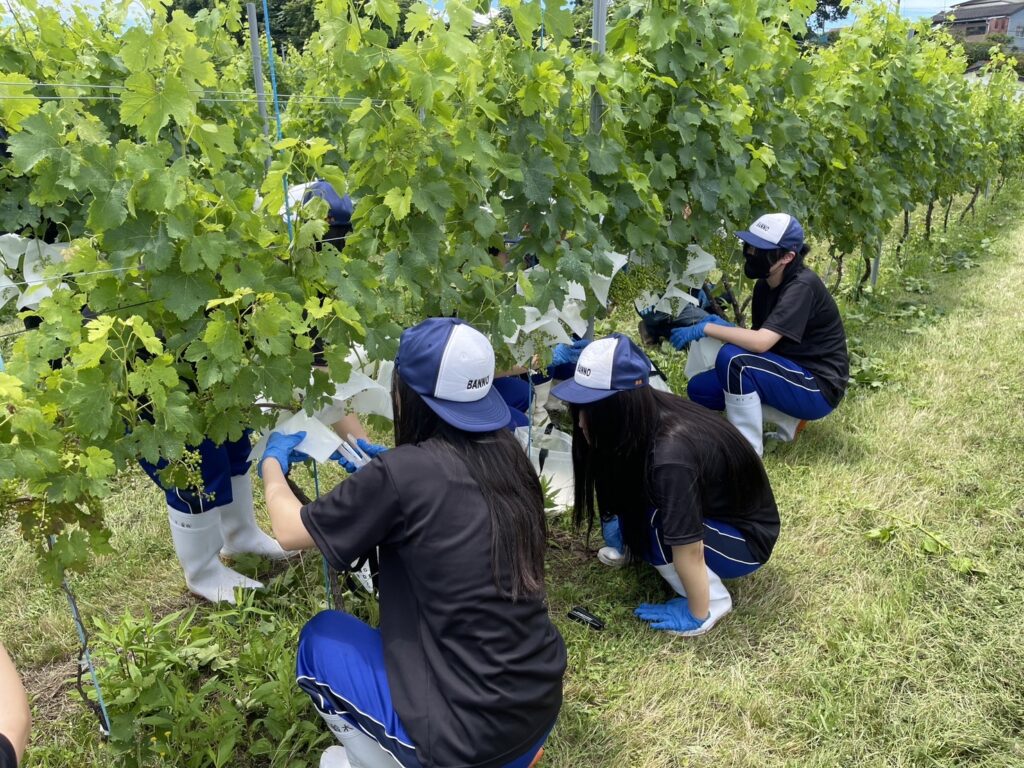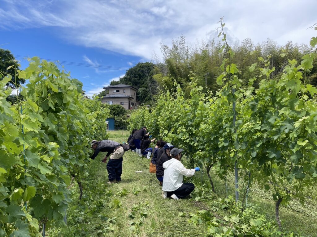 [農福連携]地元高校生に作業体験&見学をしてもらいました 2024.06.26 今日は、福島県立磐城農業高等学校・生活化学科の皆様に農福連携に関する施設見学として、 いわきワイナリーの取組について体験&講話をさせていただきました。 まずは半貫沢農園のメルローの除葉と傘かけから。 房まわりの葉を一枚一枚手でむしる除葉は、ぶどうの日当たりや風当たりを良くする大事な工程。 つづいて傘かけをしてこれからの雨に備えます。紙を慎重に被せホッチキスで止めていきます。 農作業体験の後は、ショップに戻りぶどうジュースで休憩をとりながら、四家マネージャーによる講話を通じて いわきワイナリーの農福連携の取組について理解を深めます。 最後は全員で集合写真を撮って終了です。 暑い中頑張ってくれた磐農生の皆さまありがとうございました! いわきワイナリーでは随時見学を受付けております。お気軽にお問い合わせください。 施設・見学について